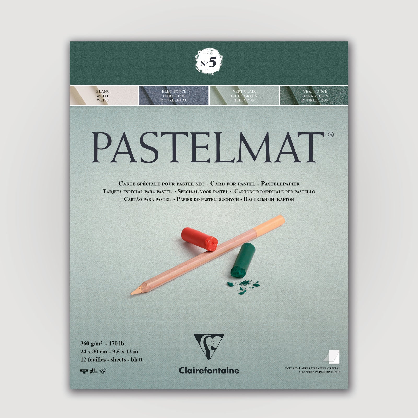 Clairefontaine Pastelmat is een uniek papier voor pastel materialen. Het zachte en hechtend oppervlak laat toe om verschillende pigment lagen te leggen zonder verzadigingseffect en zonder fixeermiddel. Het is niet schurend zoals schuurpapier of zacht zoals fluweel papier. Pastelmat behoudt al haar eigenschappen ook nat of gegomd en beperkt het gebruik van fixeermiddel. Dit papier is voor het tekenen met droge pastels, 4 nieuwe tinten. Elk blad wordt beschermd door een tussenblad.