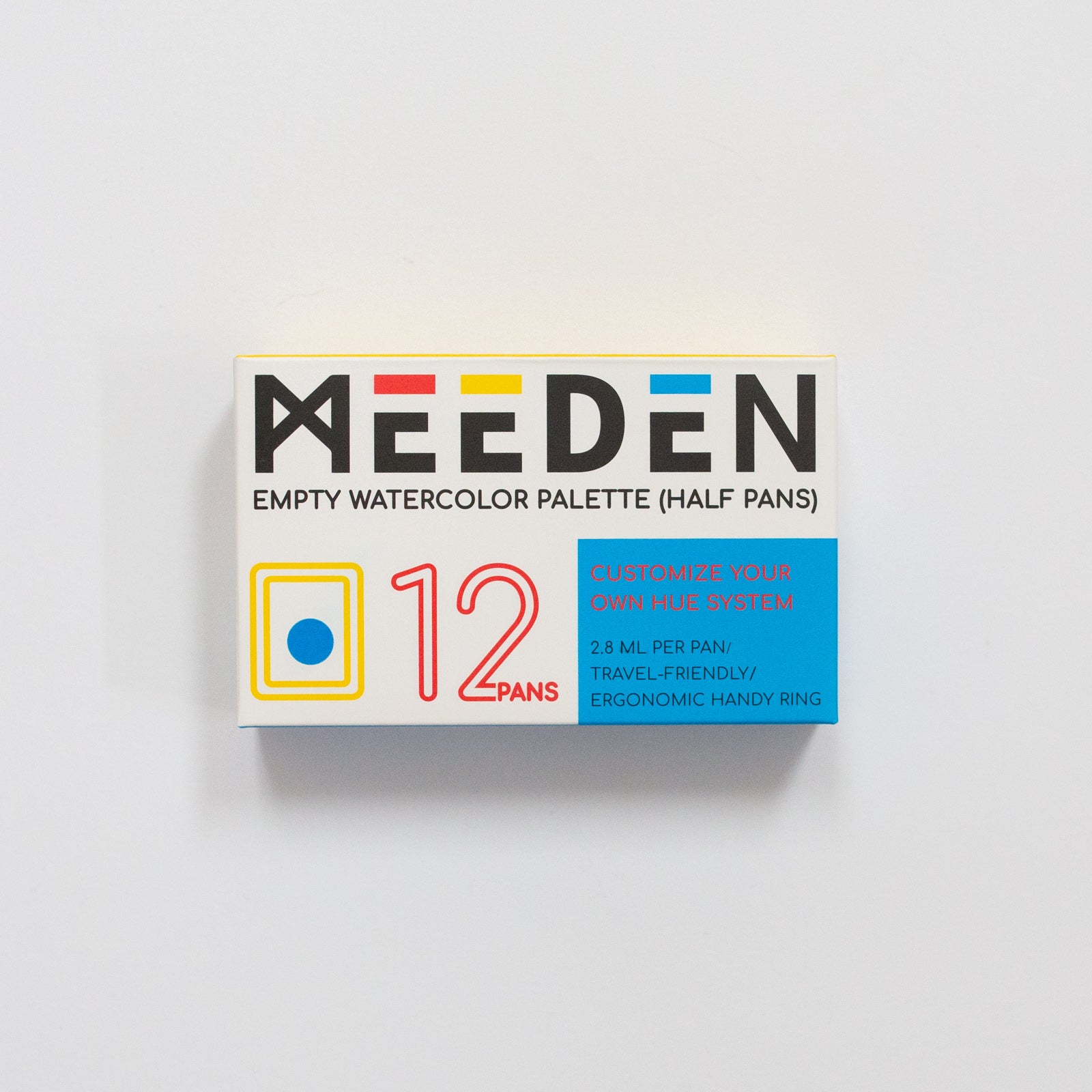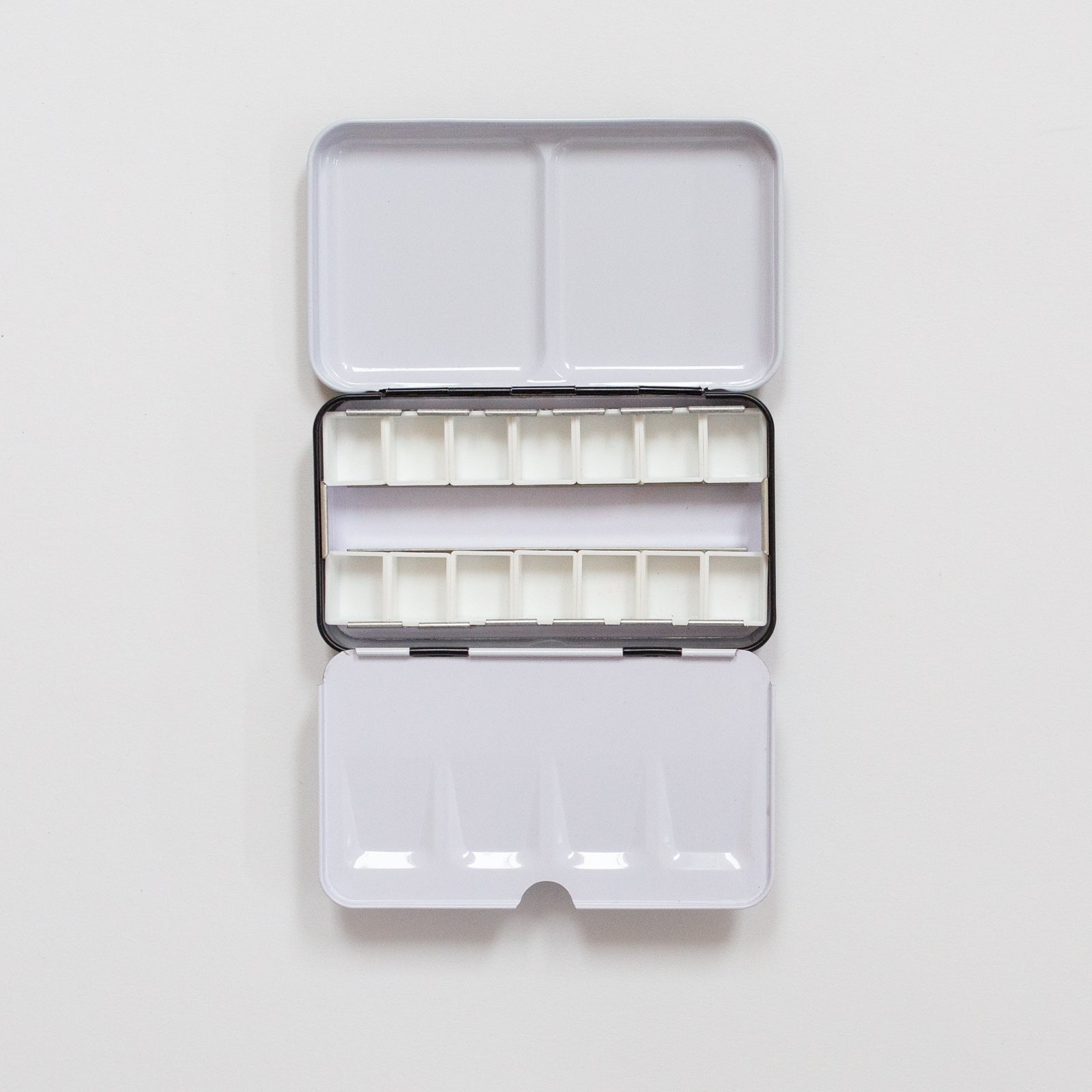 Een handig bewaarblik voor je aquarelverf. Wanneer je aquarelverf uit tubes hebt, kan je daar deze half pans mee vullen. Goed laten drogen en dan kan je de verf makkelijk meenemen. De blik wordt geleverd inclusief 12 lege napjes.