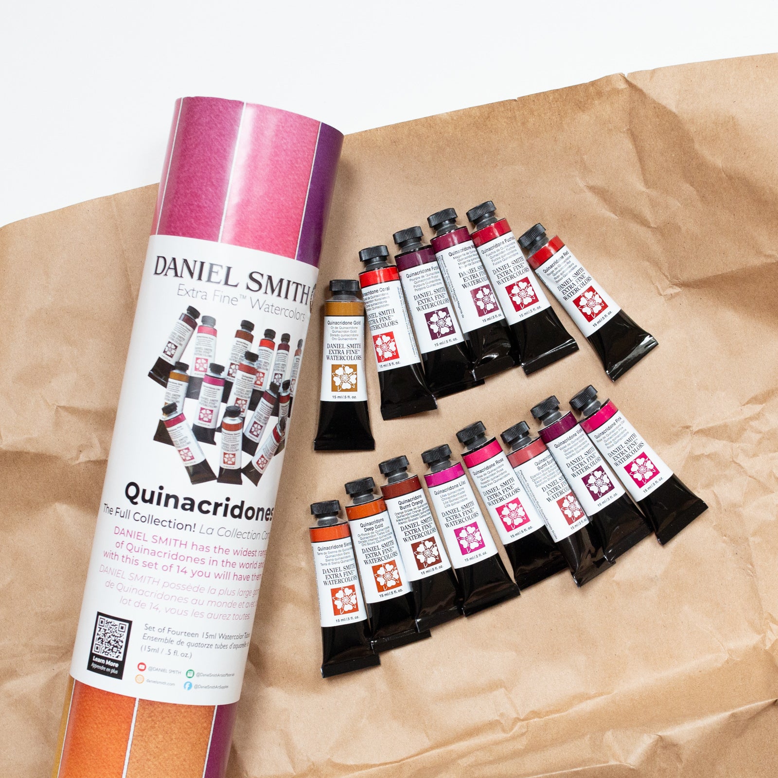 Daniel Smith heeft een unieke en grote reeks aan quinacridone kleuren. Deze set bevat 14x15ml Daniel Smith Aquarelverf.