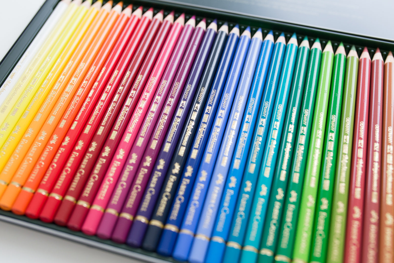 Faber-Castell Polychromos are high-quality, coloring pencils. The pencils contain a lot of pigment, are very opaque, and easy to blend. The core of a Polychromos pencil is harder than most other pencils. The pencil is popular because the tip remains sharp for a long time, but the pencil is not too hard. It's a wonderful combination.