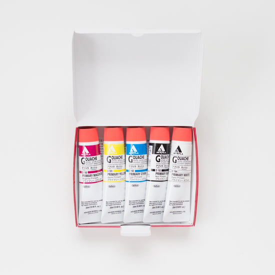 12 colors of Holbein Acryla in 20ml tubes. Holbein Acryla Gouache moves, reacts, blends, and feels the same as a traditional gouache. Holbein Acryla is water-resistant when dry.