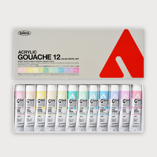This Holbein Acryla set contains 12 colors with a 20ml content. Holbein Acryla Gouache moves, responds, blends and feels the same as a traditional gouache. Holbein Acryla is water resistant when dry.