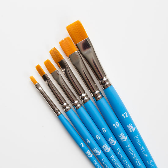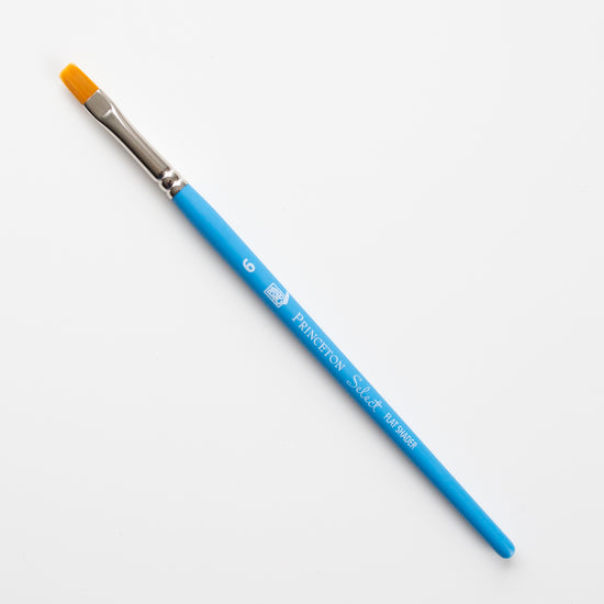 The hairs of this Princeton Select Flat Shader 6 are of medium length. Use the wide side to color large areas and the side to make thin lines.