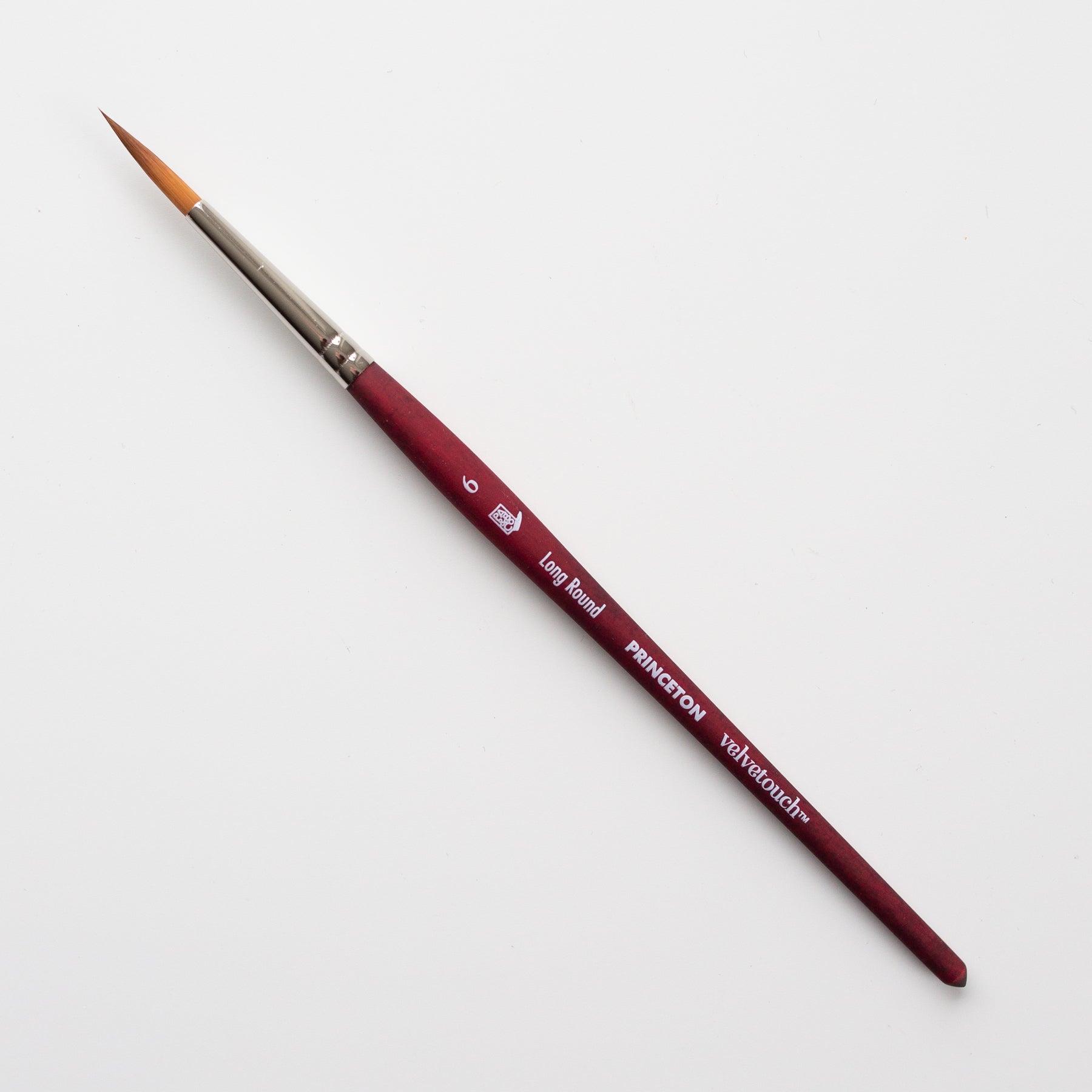 The Velvet Touch is a tapered brush. The brush has a pointed tip, which allows you to paint fine details. In addition, the brush has a large 'belly', which can hold more paint/water than the traditional round shape. The belly holds the paint well, allowing you to spread the paint in a controlled manner.