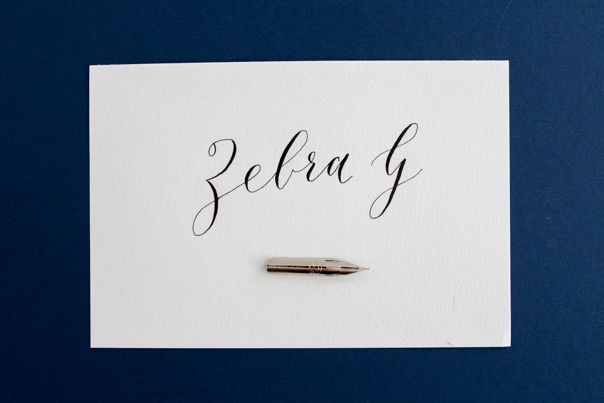 De Zebra G heeft vergelijkbare eigenschappen met de populaire Nikko G. De Zebra G is net iets minder flexibeler en heeft een iets minder scherpe punt. Ik vind dat deze nib daarom het fijnste schrijft. Ze zijn beide van stevige kwaliteit. De Zebra G is een fijne nib voor Moderne kalligrafie.