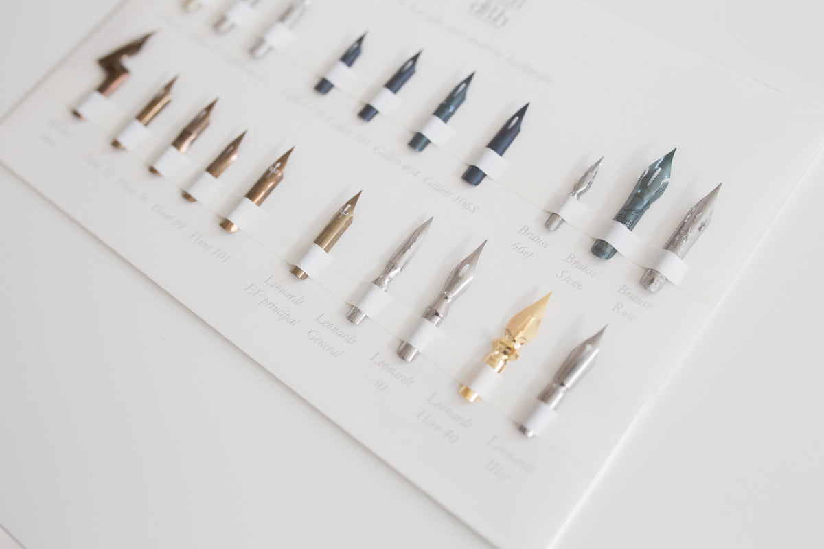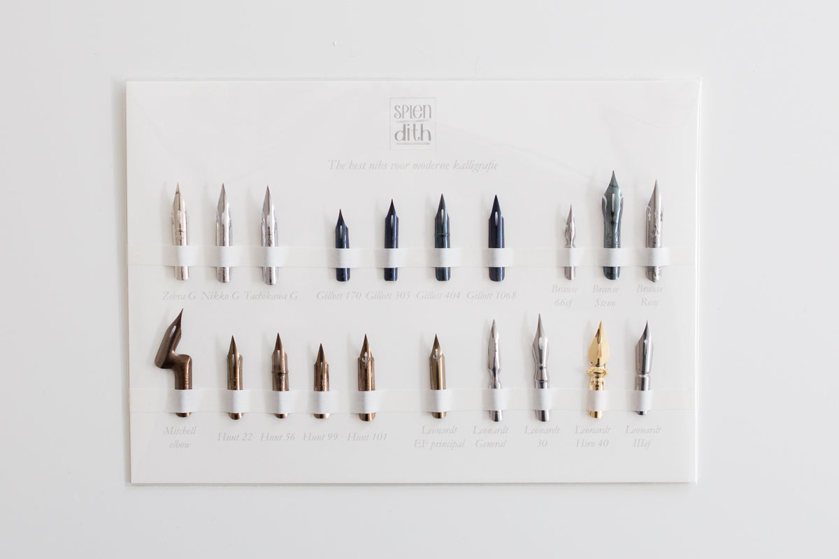 Nikko G, Tachikawa G, Gillott 170, Gillott 303, Gillott 404, Gillot 1068, Brause EF66, Brause Steno, Brause Rose, Mitchell Elbow, Hunt 22, Hunt 56, Hunt 99, Hunt 101, Leonardt EF Principal, Leonardt General, Leonardt 30, Leonardt Hiro 40. Leonardt IIIef. (Ter vervanging van een zebra g (ivm leveringsproblemen) zit er een Leonardt 40 in deze set.)