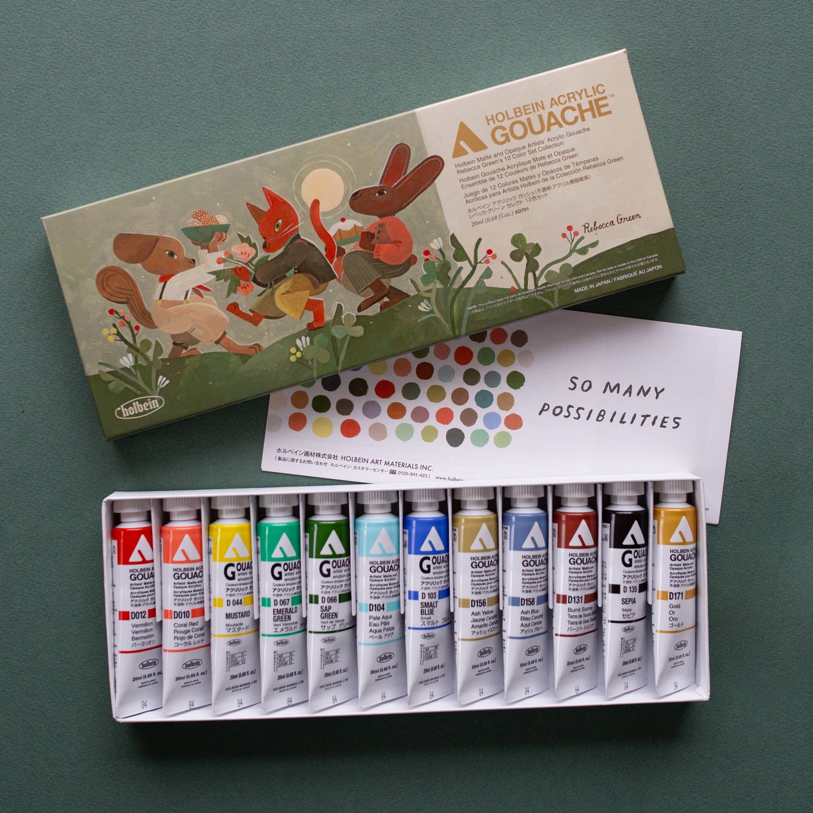 Samen met Rebecca Green heeft Holbein een prachtige set met Acryl gouache uitgebracht. In deze Holbein Acryla set zitten 12 kleuren met 20ml inhoud.