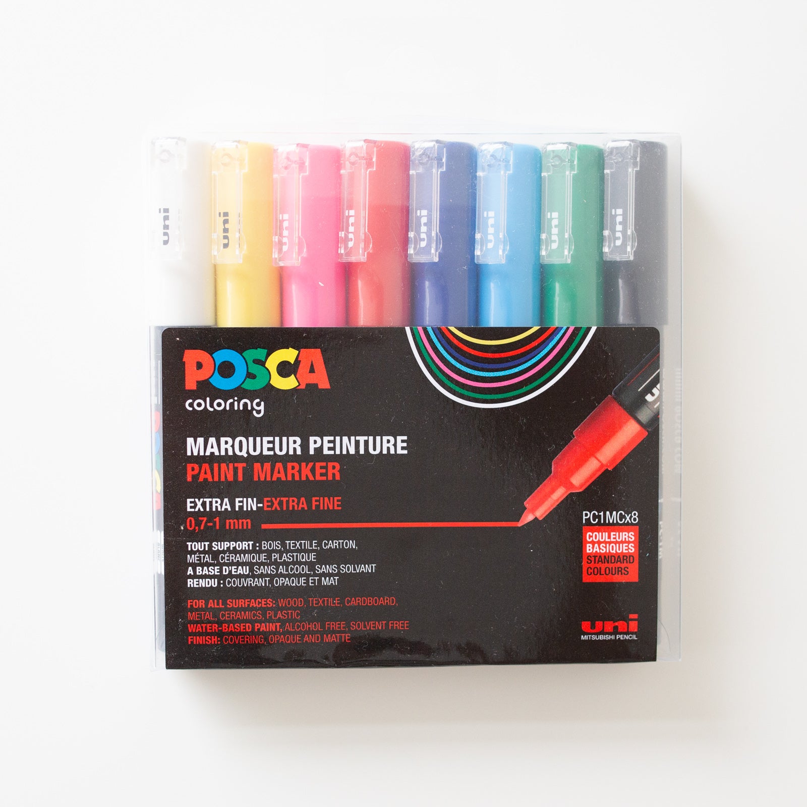Deze markers van Uni Posca zijn gevuld met goed dekkende verf in verschillende kleuren. De stiften hebben een conische punt waardoor de verf goed vloeibaar verspreid kan worden. De punten aan deze PC-1MC stiften zijn bovendien extra fijn, dus perfect voor het tekenen van dunne lijnen. De inkt in de pen is op water/acryl basis en heeft geen vervelende geurtjes. Het leuke van deze pen is dat je hem makkelijk op verschillende ondergronden kunt gebruiken, maar bijvoorbeeld ook voor het tekenen van kleine details op een bestaande tekeningen.