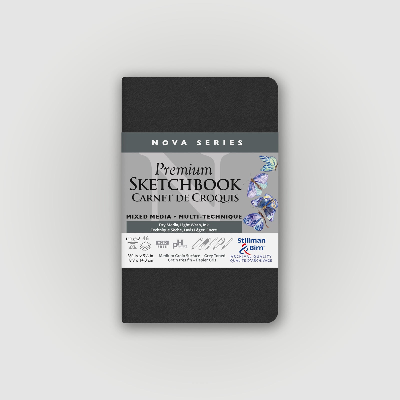 De Nova reeks van Stillman&Birn bevat meerdere tinten 150 grams papier. De schetsboeken zijn beschikbaar met beige, grijs en zwart papier. In de Nova Trio zitten in één schetsboek alle drie de kleuren.