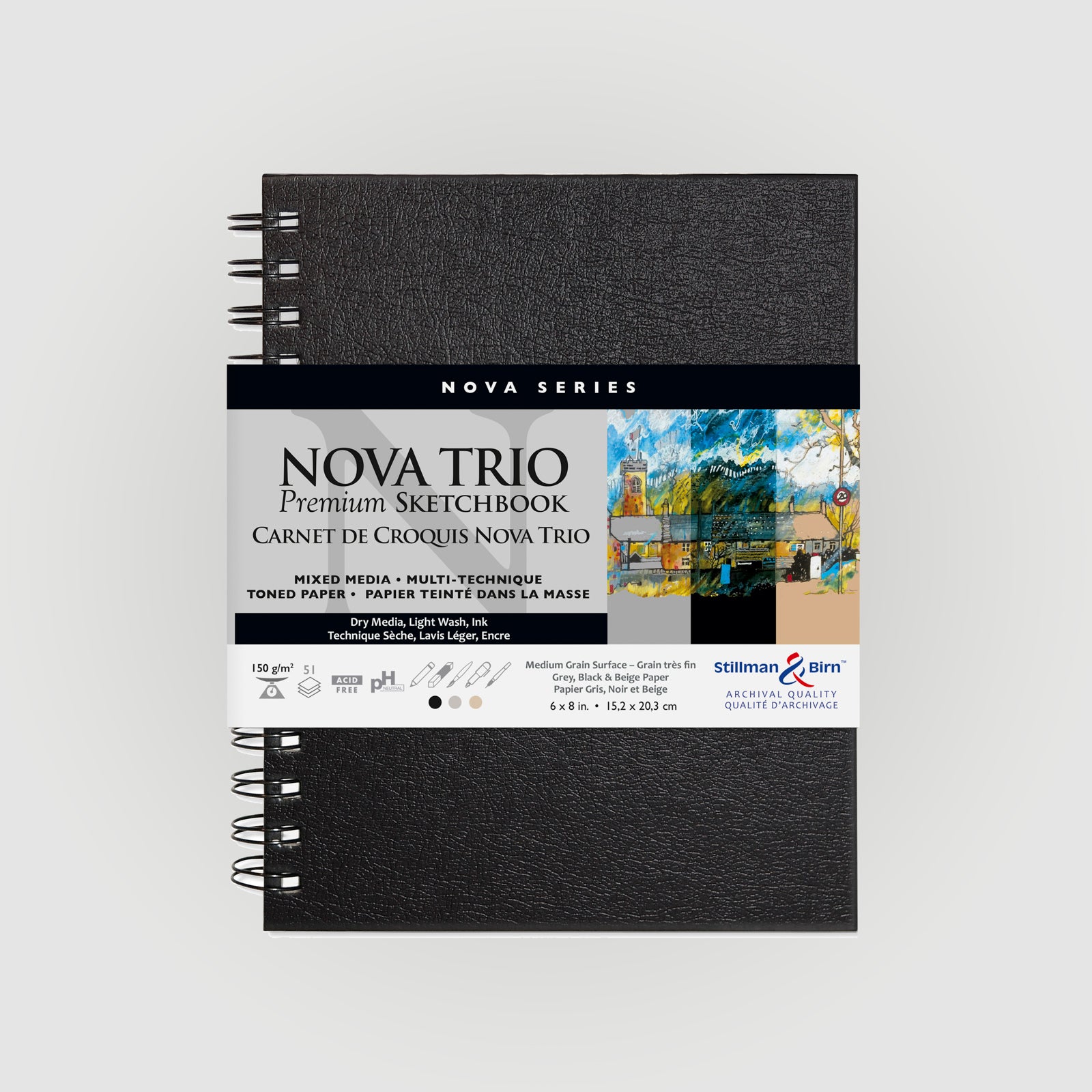 De Nova reeks van Stillman&Birn bevat meerdere tinten 150 grams papier. De schetsboeken zijn beschikbaar met beige, grijs en zwart papier. In de Nova Trio zitten in één schetsboek alle drie de kleuren.