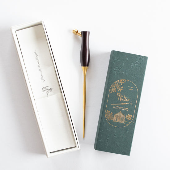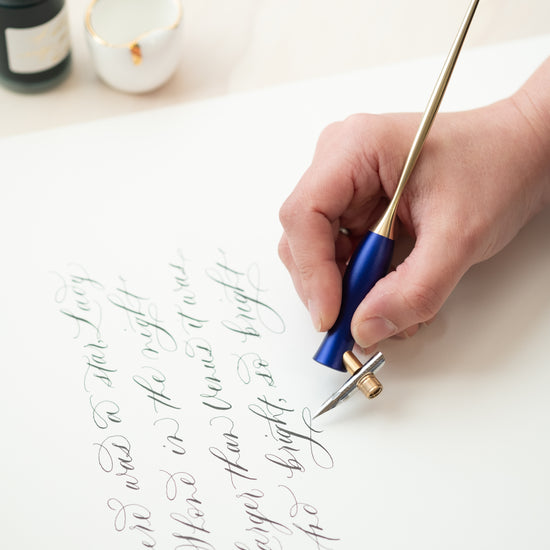De 'Bloom' Calligraphy pen van Tom's Studio is er in een rechte penhouder, maar ook in een oblique variant. De pen kan je openmaken, en in de pen kan je tot wel drie nibs bewaren. Handig om je kalligrafie materialen bij elkaar te bewaren.